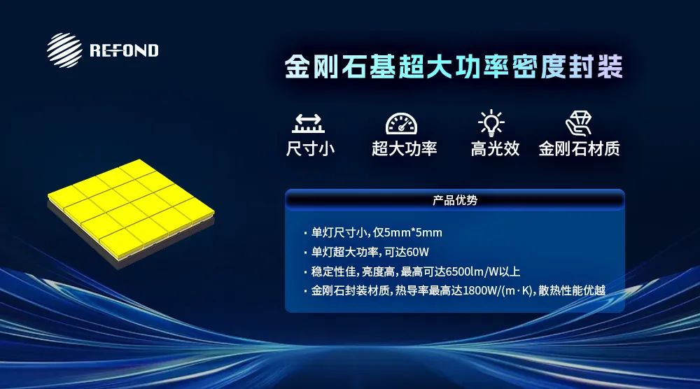 值得关注的是,瑞丰首次亮相的金刚石基超大功率密度封装新品,单灯60W高亮稳定,光效6500lm/W,5*5mm紧凑尺寸兼容主流方案,解决了传统高功率产品光衰大、热导率差等痛点,可满足各种高光效需求的应用场景。
