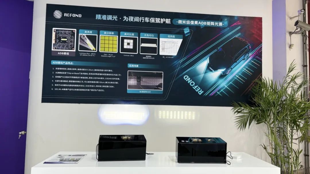 其中,瑞丰光电车规级ADB模组产品,是一大亮点。基于微米级像素间距的精细分区照明能力,可实现全路况精准光束控制;动态规避眩光的同时,为驾驶员提供最佳照明效果,提升行车安全性。支持102、84、48、24多像素方案,灵活适配各类车型,满足创新车灯个性化设计需求。