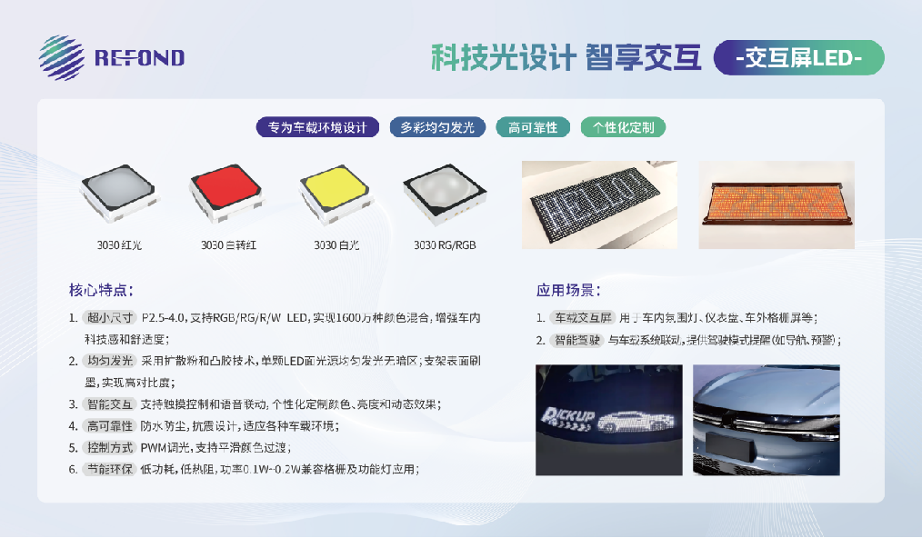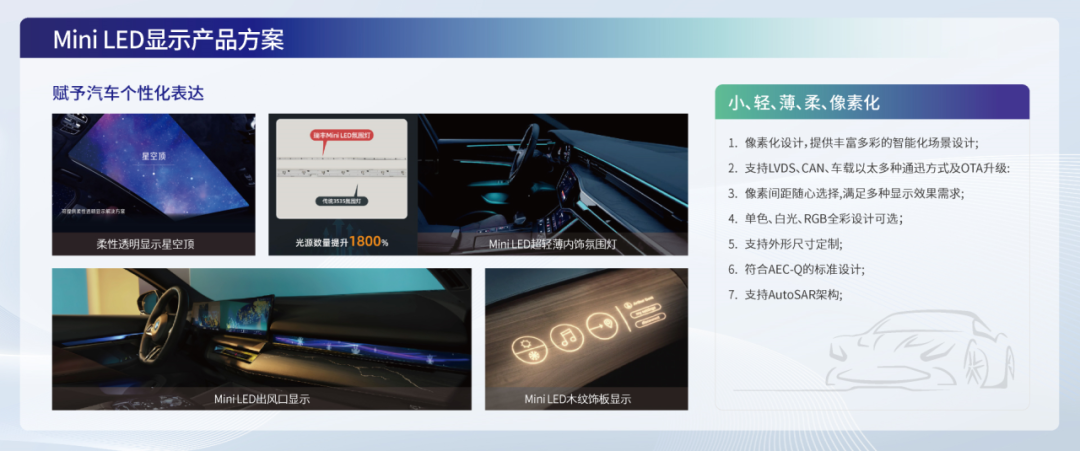 瑞丰光电在Mini LED直显产品方案持续创新突破,凭借“小、轻、薄、柔、像素化”等特性,赋能汽车内饰氛围灯、动态车标,并进一步扩展到木纹饰板显示、出风口显示、柔性透明显示星空顶等高端显示场景,支持外形尺寸个性化定制,为用户带来丰富视觉享受的同时,助力智能座舱实现从功能集成到场景融合跨越。