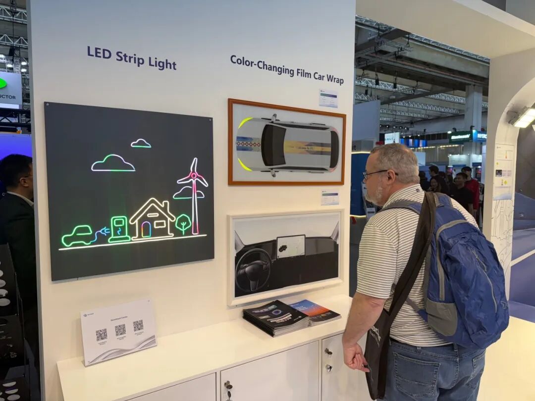 此外,瑞丰光电特别设置的变色膜艺术墙砖(方形与六边形)成为了展台热门打卡点,该系列产品与触显变色膜车衣(内饰与外饰)以灵动美学、动态个性交互及绿色环保特性,为汽车与建筑装饰领域带来科技感与可持续的创新视觉解决方案。
