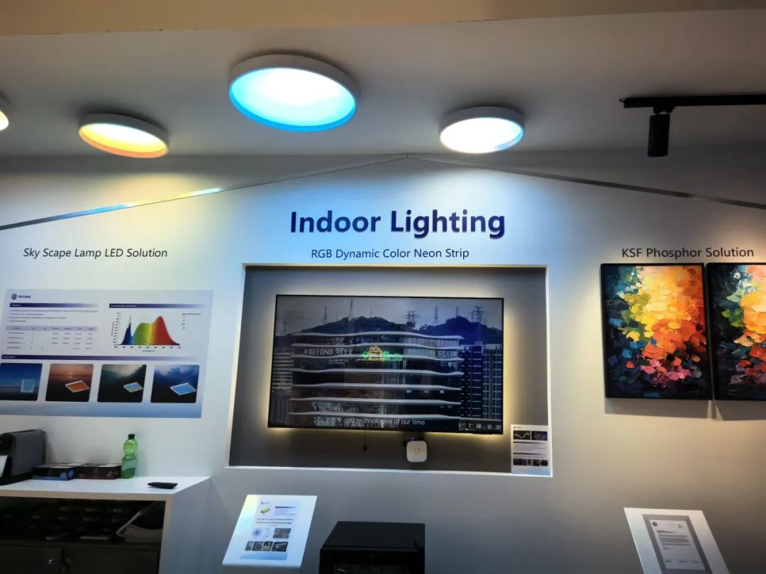 瑞丰光电重点展出的KSF高光效高显指系列产品,基于全球专利KSF荧光粉技术方案,较传统氮化物方案增亮效果显著,光效提升3%-13%,采用IPSL涂覆与真空镀膜工艺,防潮抗硫,解决光衰色漂问题,维护成本低,为高端室内、商业、智能照明提供高品质光源方案。