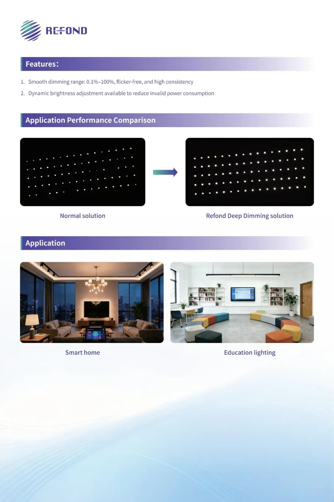 瑞丰光电Dimming精密调光方案,可实现光线从0.1%到100%的平滑调光,无闪烁且一致性佳,能动态调节亮度以降低无效功耗,可应用于智能家居、教育照明等高品质光需求场景。