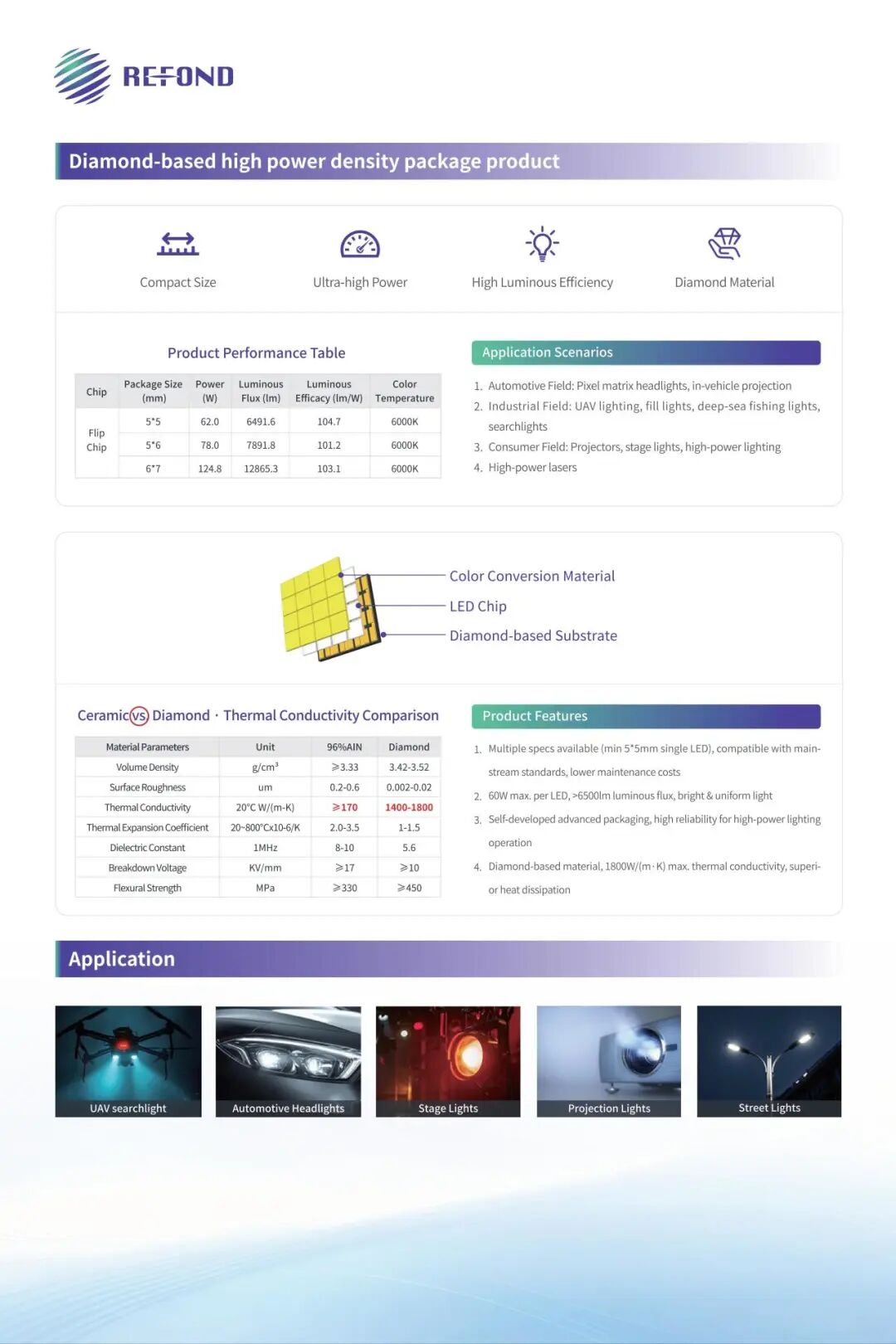 本次展会,瑞丰光电还带来了针对大功率照明创新产品,单灯60W高亮稳定输出,5*5mm紧凑尺寸设计,依托自研先进封装技术,产品具备高可靠性,可适配海洋探照灯、无人机照明、投影仪等高光效需求场景,为其提供专业照明解决方案。