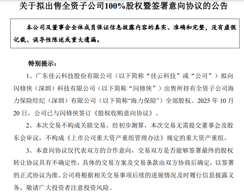 近日,广东佳云科技股份有限公司(下称“佳云科技”)发布公告,拟将其全资持有的海力保险经纪(深圳)有限公司(下称“海力保险经纪”)100%股权,转让给电子产品服务商闪修侠(深圳)科技有限公司(下称“闪修侠”),双方已于2025年10月20日签署股权转让意向协议。