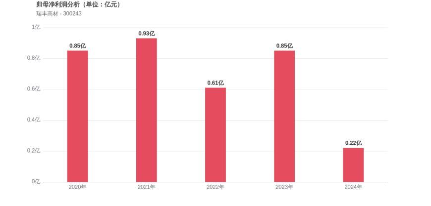 利润角度分析,2020年瑞丰高材实现归母净利润0.85亿元,2024年0.22亿元。近年来公司盈利能力持续承压,利润水平明显下滑。