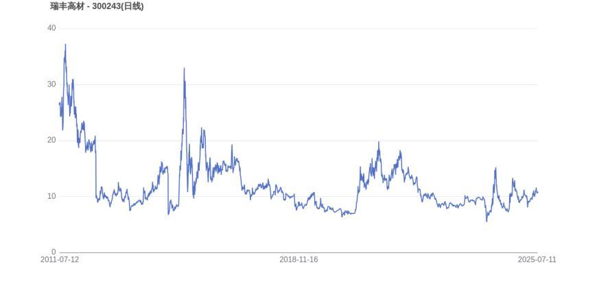 2015年6月4日,瑞丰高材的市值巅峰达到70.34亿元,股价也顺应升至34.0元。而至7月11日收盘,瑞丰高材的股价为10.76元,市值为26.95亿元,相比峰值时期市值减少43.39亿元,市值蒸发了61.69%。