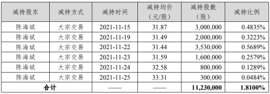 迪安诊断(300244)近日发布公告,公司股东陈海斌以大宗交易方式减持公司股份1123万股,占公司普通股总股本比例为1.81%,本次减持价格区间为31.44-33.31元/股,套现约3.53亿元。