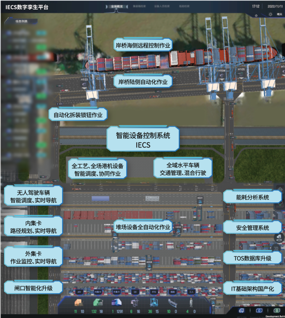 天玑智慧港口解决方案在调度层面上自主研发了码头智能设备控制系统(简称“IECS”),用以代替码头生产作业人员的大脑,并在此基础上打造了场桥全自动化改造、岸桥远程自动化升级、智能拆装锁钮机系统、内集卡智能管理终端、外集卡智能管理APP、有人/无人驾驶水平运输车辆混合作业系统、全场港机设备智能调度系统等具体落地方案,极大地促进了码头生产、管理的变革,提升了码头作业能力、对外服务水平和经济效益。