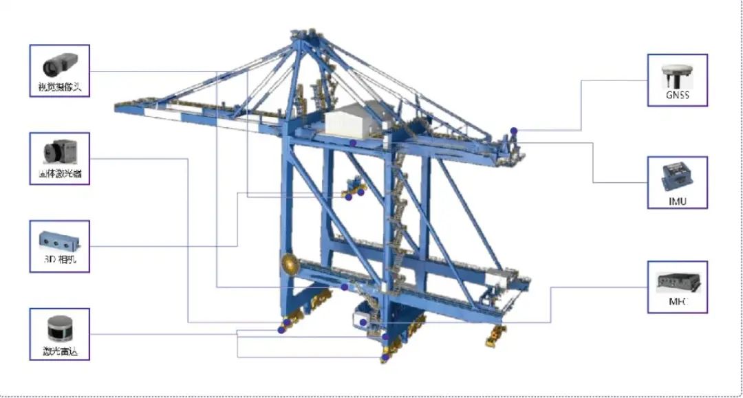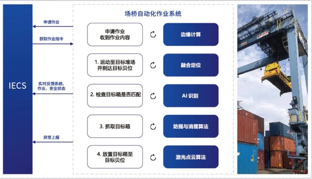 在场桥设备自动化升级方案过程中,通过加装摄像头、激光雷达、3D相机、北斗定位终端等各类设备,以及运用先进的人工智能算法,实现对传统场桥设备的智能化升级改造,并与上层系统融合打通,在IECS的指挥调度下实现集装箱的自动化装卸作业。