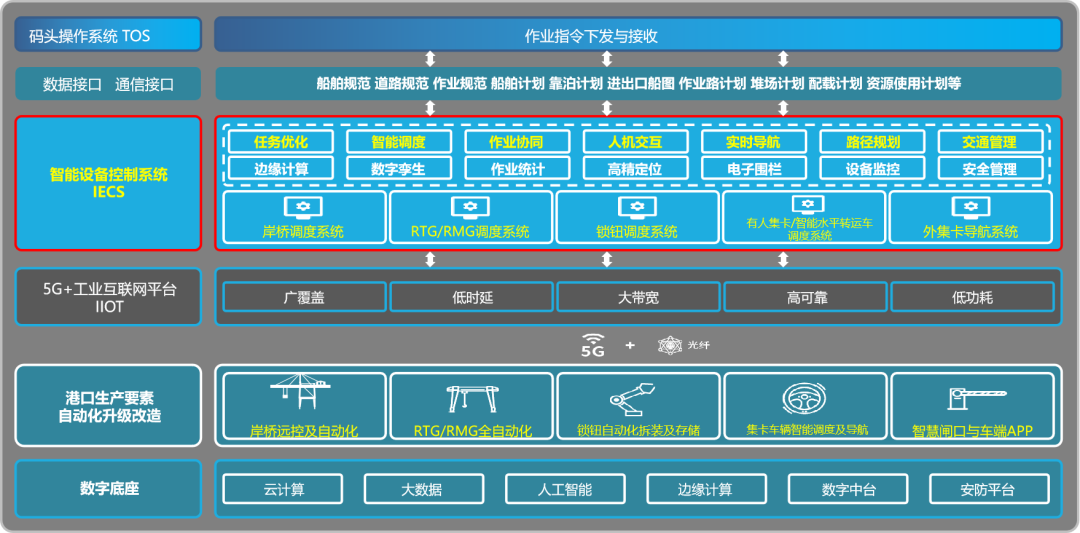 IECS通过5G、物联网、大数据、人工智能等前沿技术,以及各类传感器、感知设备等智能硬件,将码头全域各类生产要素融合管控于IECS系统中,形成以IECS为核心的港口自动化生产作业的综合管控平台,从而实现码头生产、管理的智能化变革,大幅提升码头的作业能力、对外服务水平和经济效益。