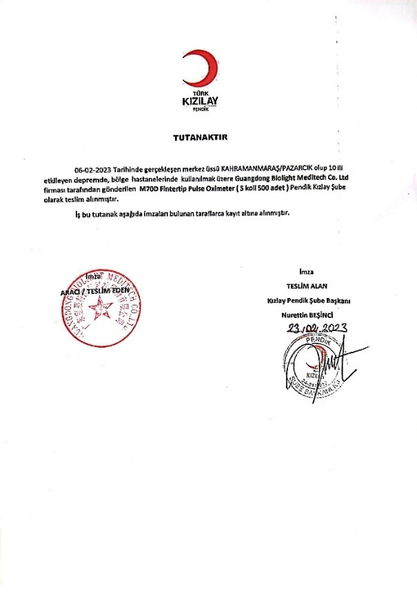 作为中国医疗设备优秀民族品牌,宝莱特集团在土耳其中资企业总商会的带领下,向灾区捐赠一批指夹式血氧仪。2月21日,物资经由土耳其本土员工到达土耳其红新月会,将温暖传递给灾区。
