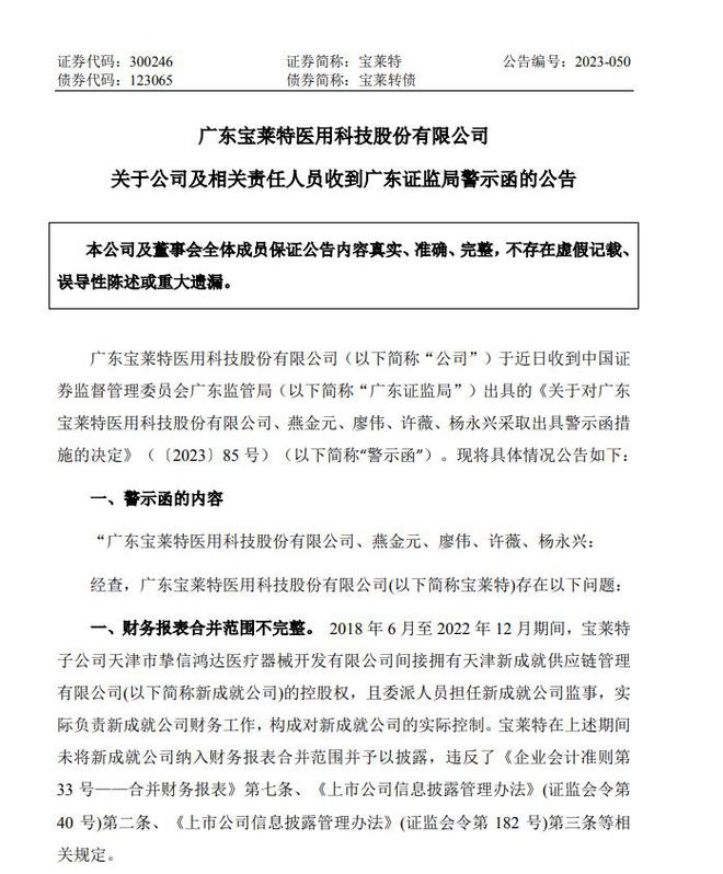 宝莱特24日盘后公告,近日收到广东证监局出具的《关于对广东宝莱特医用科技股份有限公司、燕金元、廖伟、许薇、杨永兴采取出具警示函措施的决定》(下称“警示函”)。