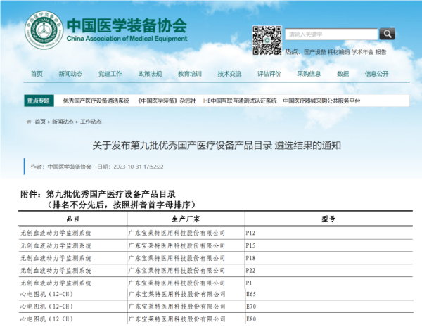 近日,中国医学装备协会正式公示第九批优秀国产医疗设备产品遴选评审结果。经过多次审查和严格筛选,宝莱特P1、P12、P15、P18、P22高端监护仪,E65、E70、E80心电图机共八款产品入选优秀国产医疗设备产品目录。