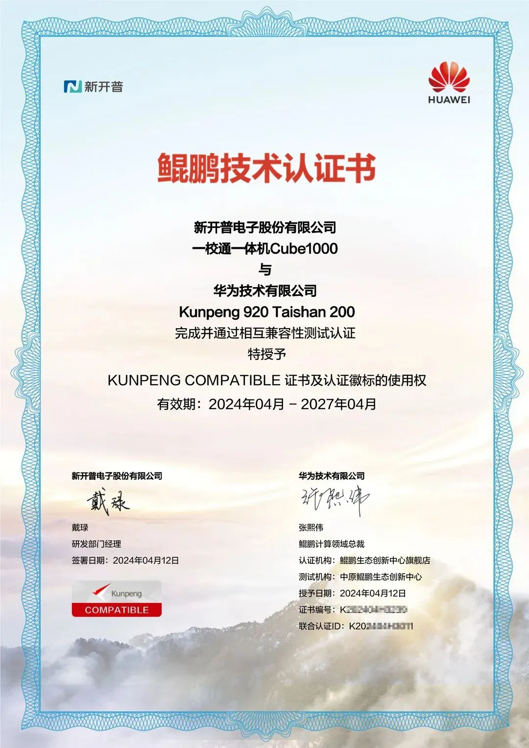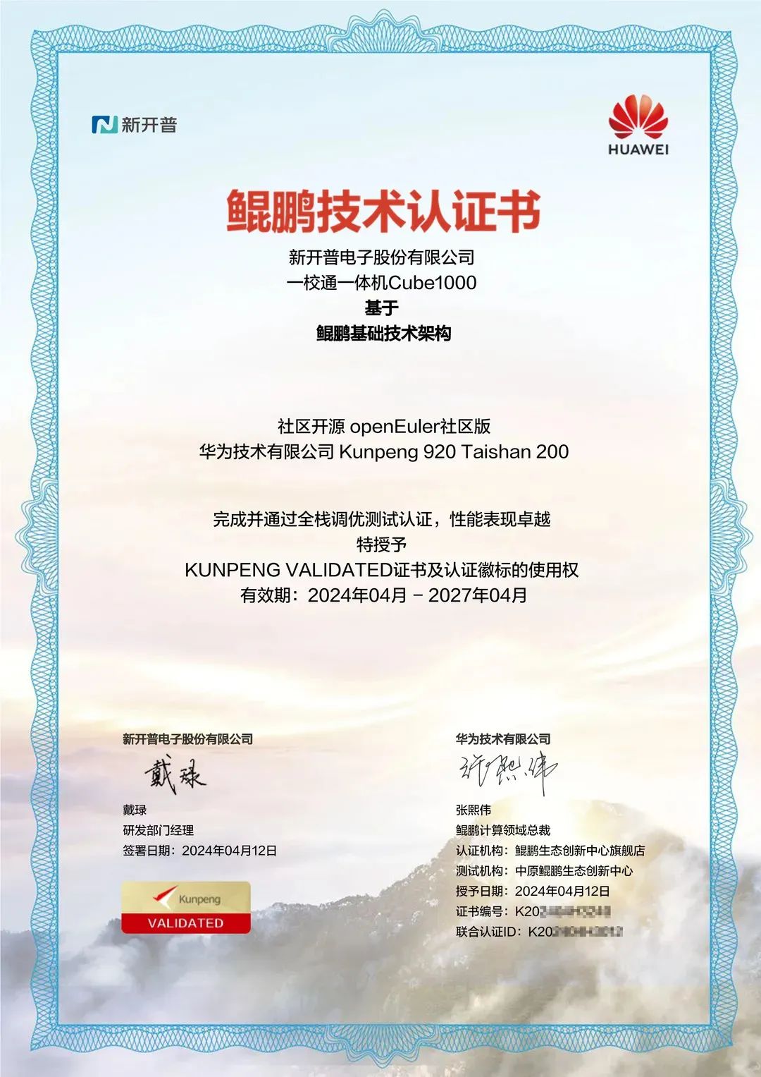 2024年4月,新开普携手华为共同打造全栈自研的一校通一体机联合解决方案,获得了鲲鹏与华为技术认证书授权及开源openEuler社区版全栈调优测试认证。