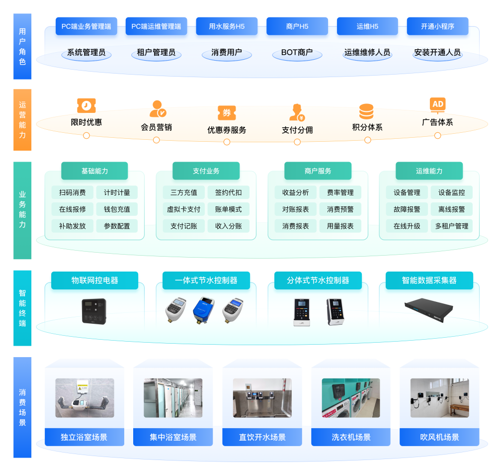 校园生活智慧服务平台以“场景一体化、角色全覆盖”为核心理念,依托云端SaaS架构和智能化管理,深度融合离线容错与主动预警技术,显著提升校园运营效能与服务体验,为高校和BOT运营商构筑一个高效协同、绿色低碳、极致可靠的智慧用水生态体系,成为驱动校园后勤现代化转型的核心数字基座。