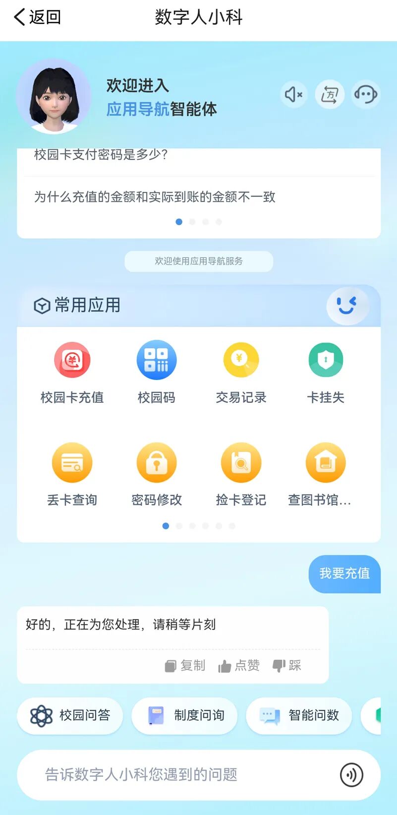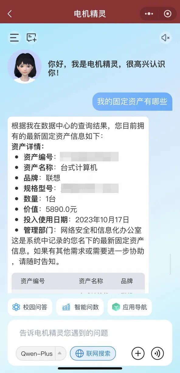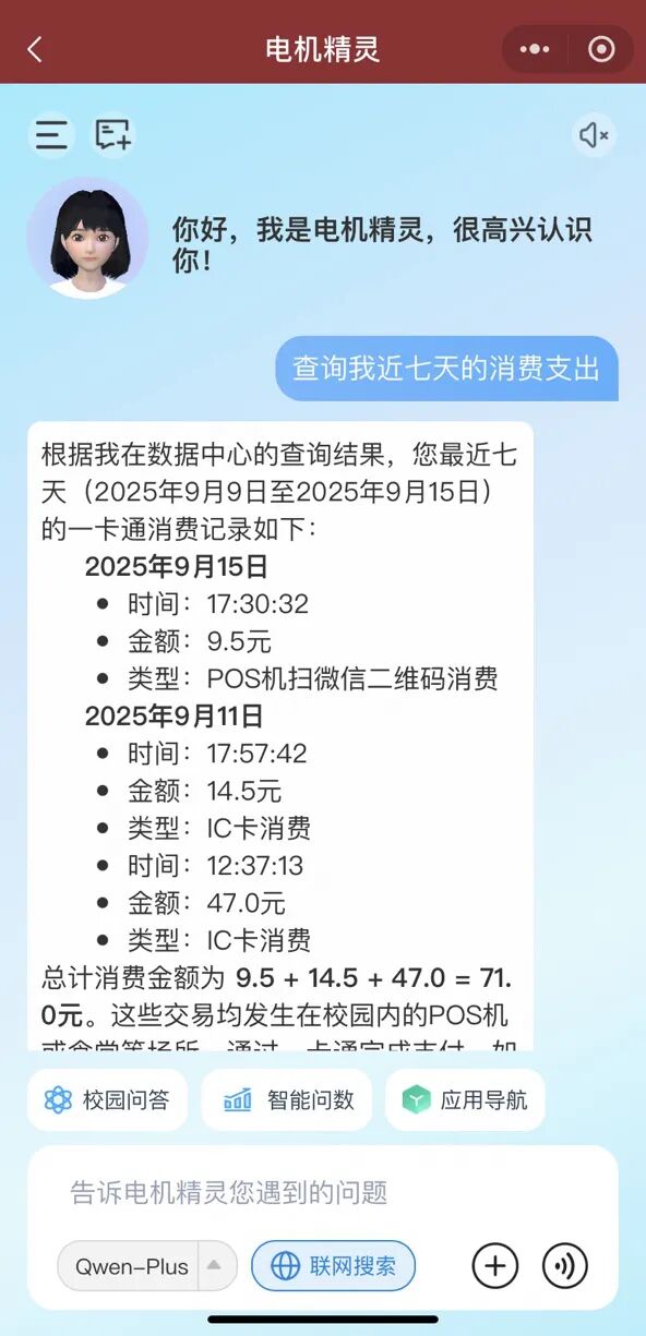 师生仅需一句自然语言指令,即可完成会议室预约、课程查询、考试安排、报修、场馆预订等上百项服务,极大简化办事流程。