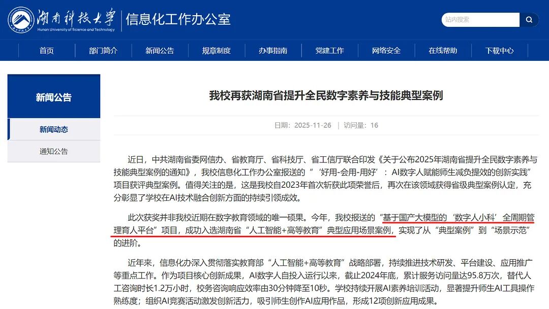 新开普为湖南科技大学打造的“数字人小科”,成功入选由湖南省委网信办、省教育厅等四部门联合评选的“湖南省提升全民数字素养与技能典型案例”。