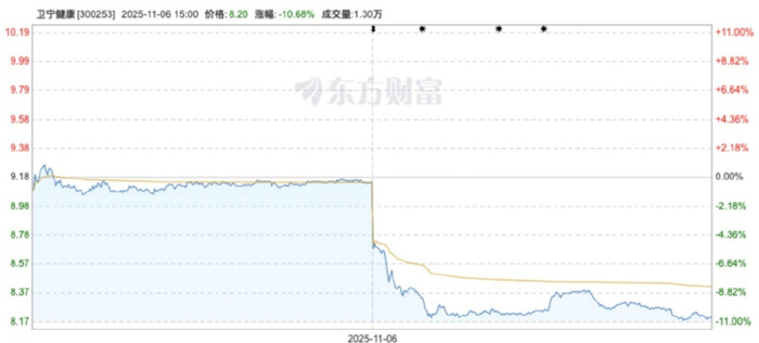 受此消息影响,11月6日上午开盘,卫宁健康股价便大幅下挫,收盘跌至8.20元/股(按前复权计算,下同),当日跌幅达到10.38%,相较于2025年内(2月17日)触及的14.54元/股阶段性高点,已下跌43.60%。