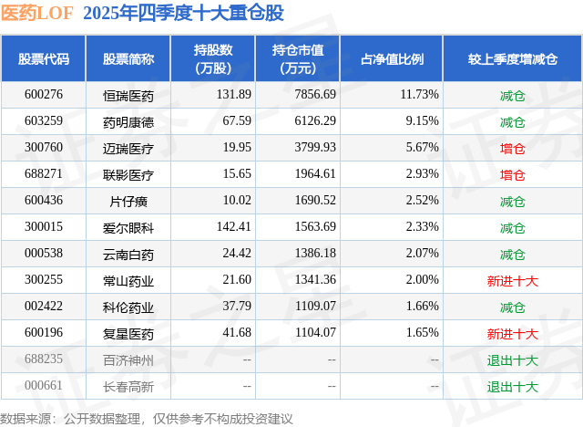 医药LOF的前十大重仓股如下: