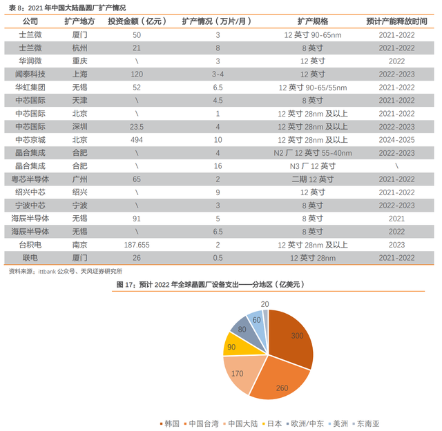新冠疫情导致半导体行业整体的产能受到冲击。应对产能缺口,晶圆厂商纷纷扩产。根据 ittbank 数据显示,预计 2021 年中国大陆晶圆厂扩产投资规模为 1130.16 亿元,可提供产能 91-92 万片/月。半导体设备是晶圆制造厂的最大投资项,约占整体投资总额的 75-80%,预计随着晶圆厂产能扩产项目的建设,会带来大量半导体设备需求。