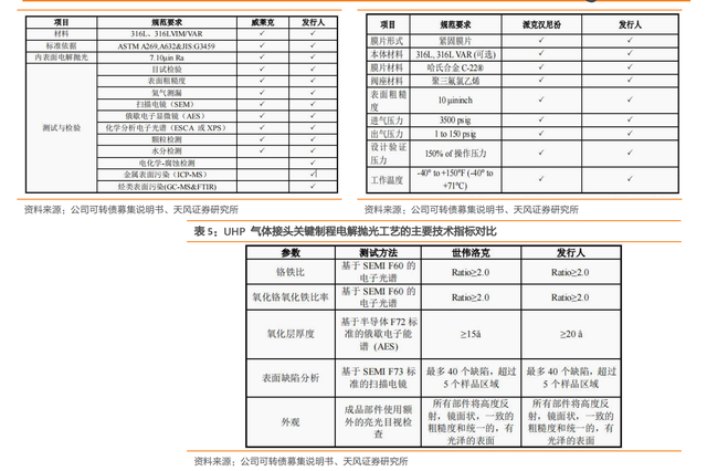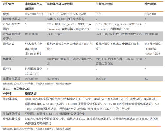 公司高洁净应用材料产品对材质和工艺有很高的要求,其中半导体真空应用领域符合 ISO、 ASA、JIS 应用标准;半导体气体应用领域符合 SEMI、ASTM、JIS、GB 应用标准;生物医药领域符合 ASME、BPE 应用标准;食品领域符合 KL 应用标准。这些应用产品在各个领域获得了广泛的国际资质认证,达到国内外先进水平。