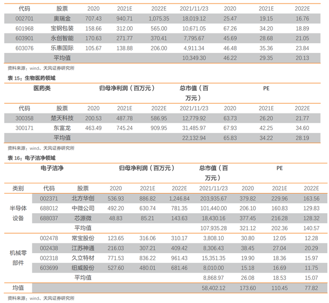 在食品包材和设备领域,参照可比公司给予 2022 年 20 倍 PE 估值;在生物医药领域,参照可比公司给予 2022 年 28 倍 PE 估值;在电子洁净领域(属于半导体领域),我们考虑参考半导体设备公司 2022 年的平均 PE 和机械零部件公司 2022 年的平均 PE,再取平均,给予 2022 年 78 倍 PE 估值。