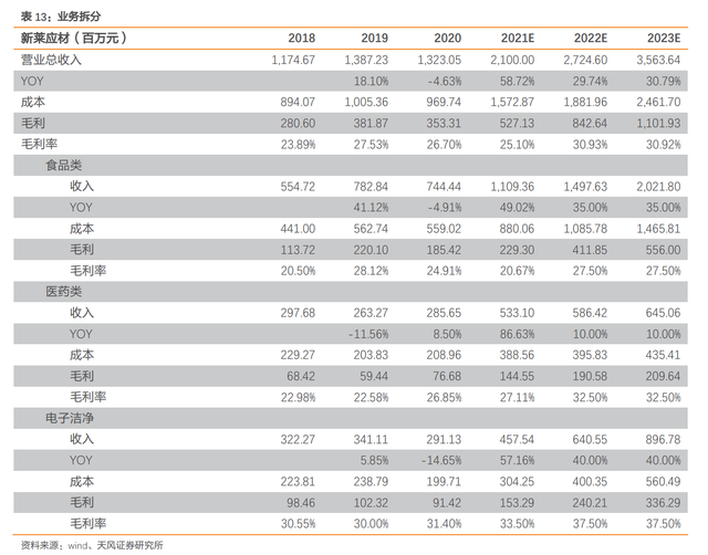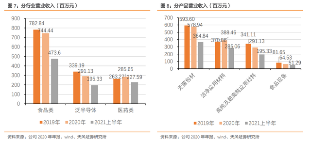 在食品类领域,结合 2021 年的高增长态势,我们估计未来两年食品类收入年增长率达 35%;在医药领域,经过一年的研发和临床试验,2021 年全球新冠疫苗开始大规模量产,同时带动了相应制造设备的需求,公司在医药生物领域的高洁净材料产品的增量也比较高。