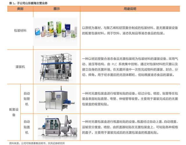 目前,公司子公司山东碧海是液态食品领域为数不多的能够同时生产、销售纸铝塑复合液态食品无菌包装纸和无菌纸盒灌装机的企业之一。