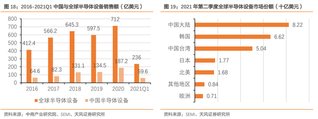 2021 年第一季度全球半导体制造设备出货金额较去年同期大幅增长 51%,比上一季度也有 21%的增长,达到 236 亿美元,中国半导体制造设备出货金额达 59.6 亿美元。2021 年第二季度中国大陆半导体设备市场份额达 82.2 亿美元。