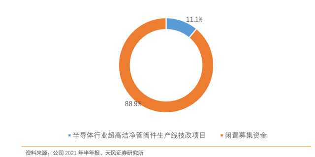 2019 年公司通过发行可转债募集资金,实际募集资金净额为 2.69 亿元。截至 2021 年 6 月底,该资金直接投入 2.25 亿元,其中直接用于半导体行业超高洁净管阀件生产线技改项目 0.25 亿元,其余闲置资金用于提高公司流动性。