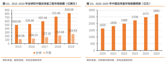 受电子信息产品市场需求释放等因素的影响,下游行业对洁净室的需求不断增加,洁净室工程行业市场保持了稳定的增长趋势,根据智研咨询的数据显示,2019 年全球和中国洁净室工程市场规模分别达到 818.58 亿美元、254.64 亿美元。
