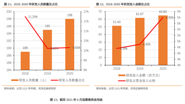 2018-2020年公司研发人员数量和研发投入均呈上升趋势,其中研发投入占营业总收入比例逐年上升,分别为 4.38%、4.45%和 4.90%。