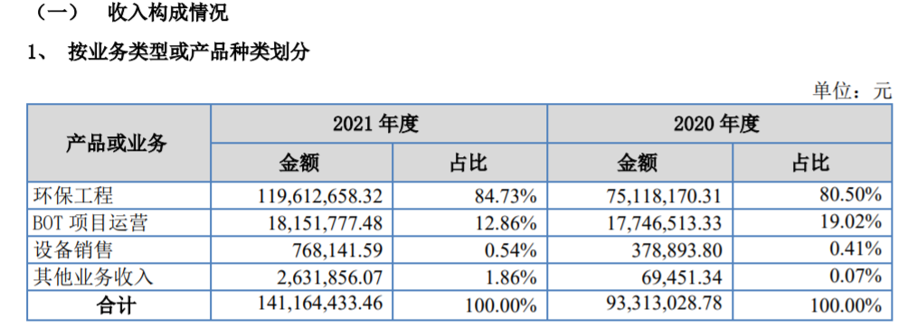 2020年、2021年,艾尔旺综合毛利率分别为43.74%、35.03%,2021年毛利率下降了8.71个百分点。记者注意到,虽然公司毛利率有所下滑,但与同行业可比公司相比,仍处于相对较高的水平。2021年,艾尔旺两大主要收入来源环保工程、BOT项目运营,毛利率均高于同行业可比公司。