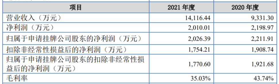 公开转让说明书(申报稿)显示,2020年、2021年,艾尔旺分别实现营业收入为9331.30万元、1.41亿元,分别实现净利润为2198.97万元、2010.01万元。由此看来,2019年以来,艾尔旺的净利润一直呈现持续下滑趋势,即使2021年营业收入同比增长,但净利润下滑情况仍在继续。