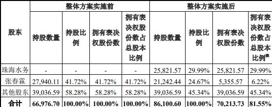 本次非公开发行股票价格为4.42元/股,发行数量为1.91亿股,不超过本次发行前公司总股本6.70亿的30%。本次发行前,公司实际控制人张春霖合计持有上市公司股份2.79亿股,占公司总股份比例为41.72%。张春霖与珠海水务签署了《合作框架协议》及附生效条件的《股份转让协议》,同时,公司与珠海水务签署了附生效条件的《股份认购协议》。上述协议生效并实施完成后,上市公司控制权将发生变更,珠海水务直接持有公司股份比例为29.99%;张春霖持有公司股份比例为24.67%,公司控股股东将由张春霖变更为珠海水务,实际控制人将由张春霖变更为珠海市国资委。