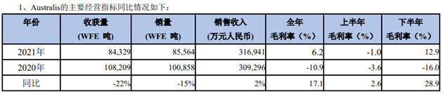 不仅是子公司Australis,公司的总体情况也是相似的。佳沃食品主营产品的行业分类属于动物蛋白,2021年的销售量、生产量和上一年相比,出现了19.15%、18.49%的减少,在这样的情况下,2021年度佳沃食品营业收入比上一年度增长了1.60%。