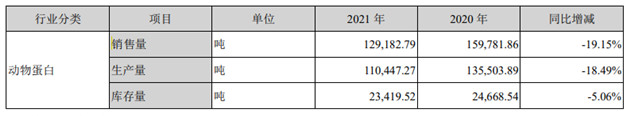 值得注意的是,2021年度销售量为12.92万吨,生产量为11.04万吨,两项对比,销量多1.88万吨;而在库存量变化方面,2021年库存2.34万吨比上一年减少仅0.12万吨(-5.06%)。