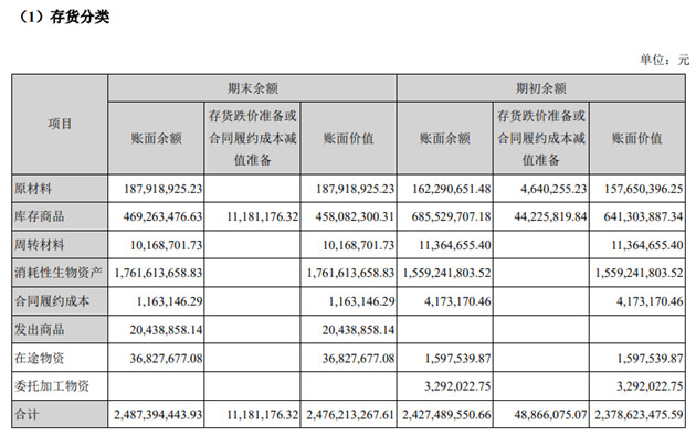 在“存货分类”项目中,消耗性生物资产金额最大,账面价值为17.62亿元,较期初增长12.98%;库存商品账面价值4.58亿元,较期初下降28.57%;库存商品的跌价准备期末余额为1,118.12万元,较期初下降74.72%。