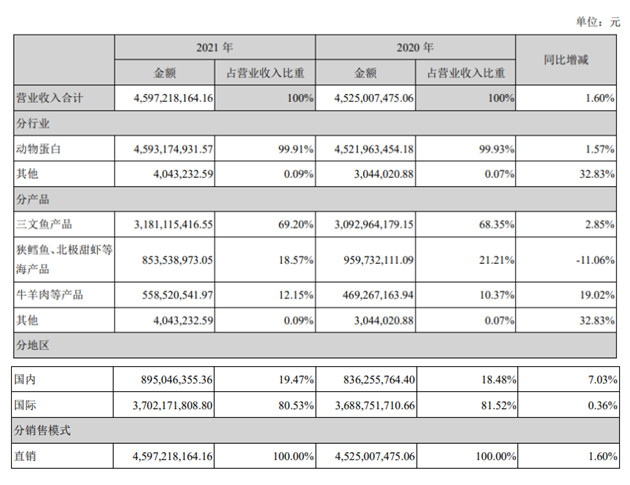 2021年度,公司主要产品三文鱼的收入为31.81亿元,占比达到69.20%。该产品在2021年度的毛利率为4.84%,而上年同期毛利率为-12.19%,相比之下本年度毛利率上升了17.03个百分点。