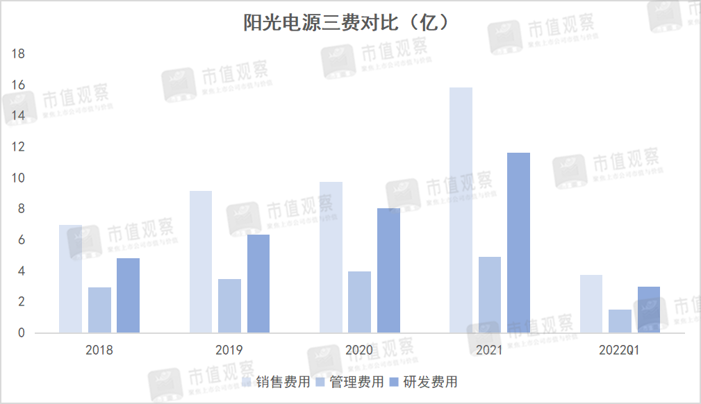 步调太大典型的就是三费。数据显示,2021年阳光电源全年销售费用达15.83亿,同比增长62.69%;研发费用为11.61亿,同比增长44%;管理费用4.91亿,同比23.99%。