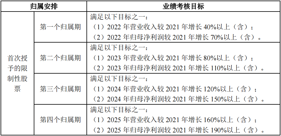 对于市场展望,阳光电源依旧十分乐观:大幅调高了2022年营收预期。股权激励也显露出这一点:几个归属期要求逐年增加。从往年看,尤其是归母净利润一项,除了上市早期及2017、2020年等个别年份,能够达标的并不多。