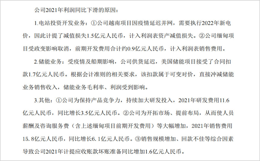 因为疫情,越南项目延迟了交付,储能业务也缴纳了罚款,同时还包括缅甸政变不可抗力、汇兑损失、应收账款坏账准备、研发和销售费用大增等。据财报公布后的业绩说明会显示,对净利润的影响大约有10亿元。