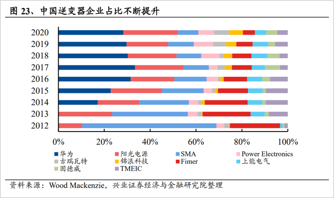 另外,技术领先也是实现赶超的重要原因,尤其以阳光电源和华为为引领。