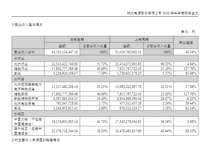 而进一步使得阳光电源脱离国内光伏行业满目疮痍的惨状的关键在于,公司主营市场在海外。2025 年1-6月海外收入254亿元,占比58.4%,较 2022 年的 47.5%大幅提升。2024年数据显示,其海外业务毛利率41.6%,是国内业务的近两倍。
