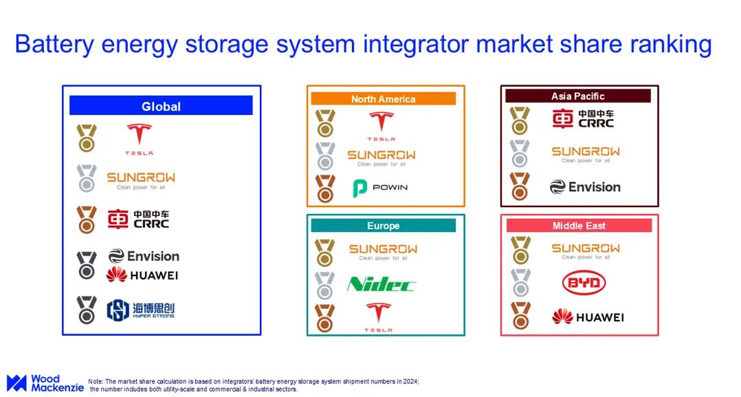 根据伍德麦肯兹2025年全球电池储能系统集成商排名中,阳光电源以14%的市场份额稳居第二,与第一的特斯拉15%的市场份额几乎无差别。但在北美市场,特斯拉以39%的市场份额处于垄断地位,阳光电源保持第二的排名,但市场份额从17%降至2024年的10%。