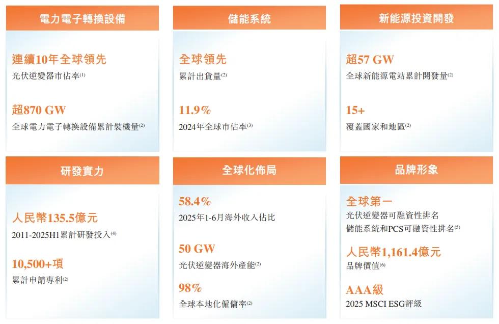于往绩记录期间,公司的业务收入主要来源于光伏逆变器等电力电子转换设备、储能系统及新能源投资开发。公司以光伏逆变器和储能系统为代表的主要业务板块,均处于全球领先地位。截至2022年、2023年及2024年12月31日以及2025年6月30日,公司在全球开发的光伏电站、风电场累计已达31GW、40GW、54GW及57GW。