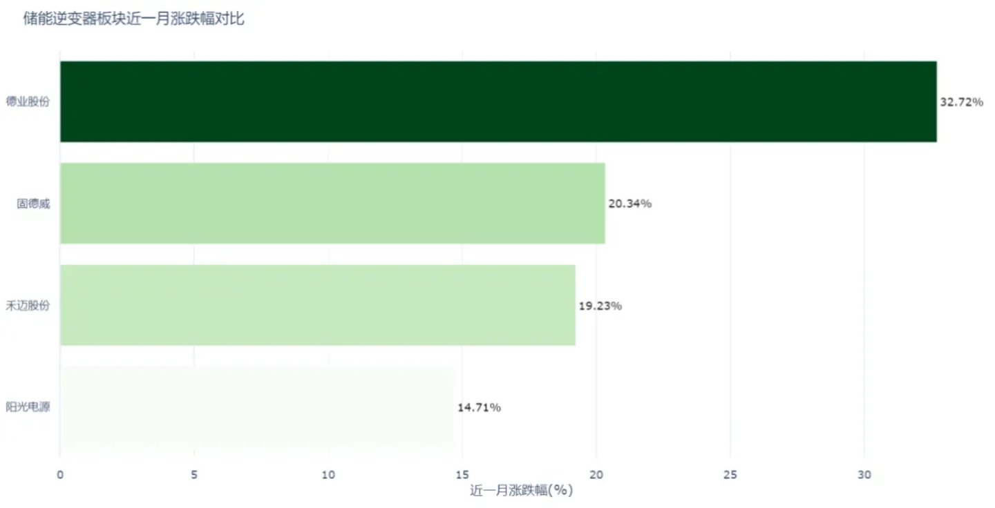 从近一个月的股价表现来看,德业股份涨幅最为突出,达到32.72%,市值升至1186亿元;固德威涨幅20.34%,市值240亿元;禾迈股份涨幅19.23%,市值158亿元;阳光电源涨幅14.71%,市值3464亿元,是板块中体量最大的标的。