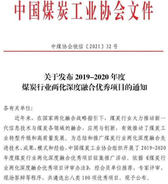 根据中国煤炭工业协会“中煤协会统信[2021]32号”文件通知,重庆梅安森科技股份有限公司参与的陕煤曹家滩智能矿井管控平台荣获2019-2020年度煤炭行业两化深度融合优秀项目。