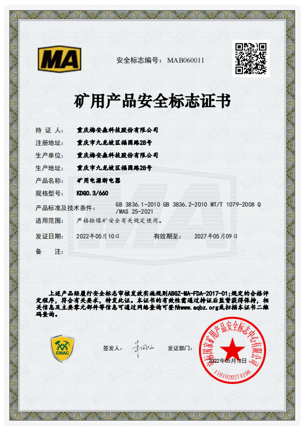 新获KDG0.3/660矿用隔爆型电源断电器安标证书