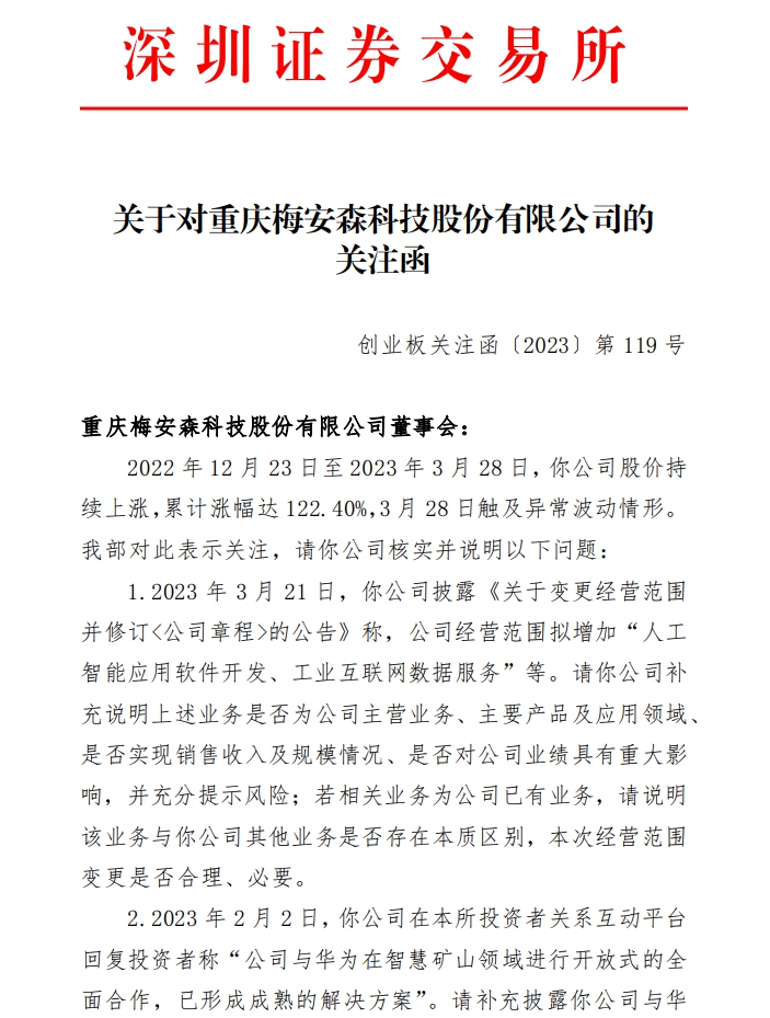 深交所29日向重庆梅安森科技股份有限公司(下称梅安森)下发关注函,追问其经营范围拟增加“人工智能应用软件开发、工业互联网数据服务”、与华为合作等是否对公司业绩具有重大影响。